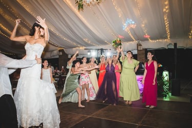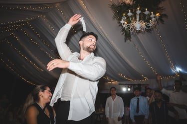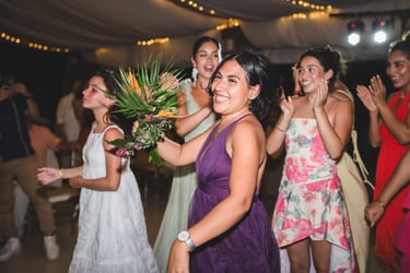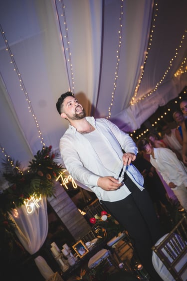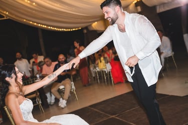 Thoughtfully orchestrated by Sociale Events, every detail reflected the couple’s vibrant spirit and joyful energy. Abstract Design brought the vision to life through a modern tropical palette — bold reds, lush greens, and sculptural florals — from the bride’s bouquet to the open white chuppah, allowing the ocean to become part of the design. The reception was complemented by a two-tier white wedding cake by Rosa Pastel, adorned with the same vivid florals.