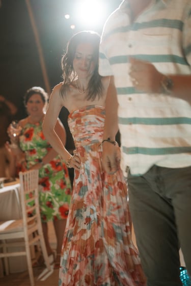 The ceremony space reflected the couple’s understated elegance — a modest beach chuppah with floral accents in beige, white, and natural greens. Designed through a collaboration between Atelier and Abstract Design, the setting felt organic and intentional, allowing the focus to remain on connection, presence, and the beauty of simplicity.
