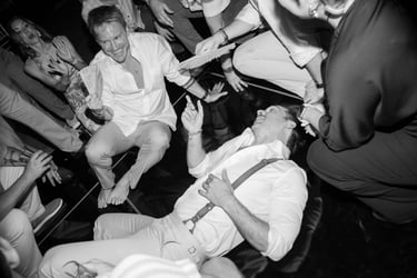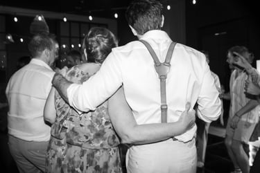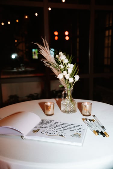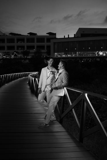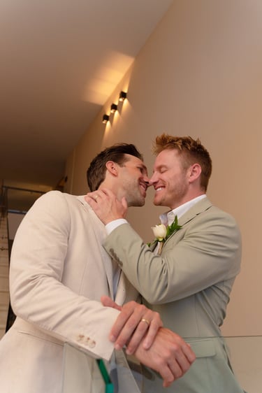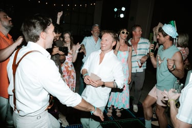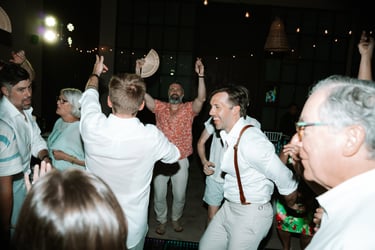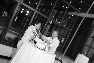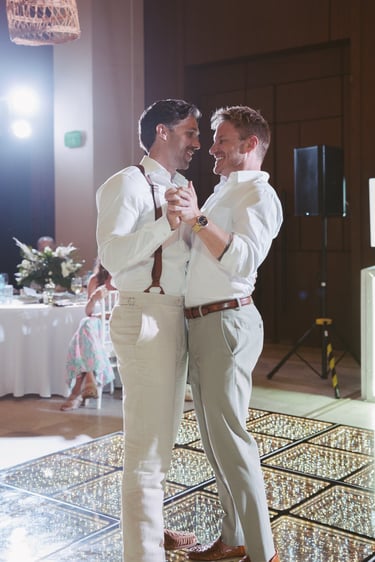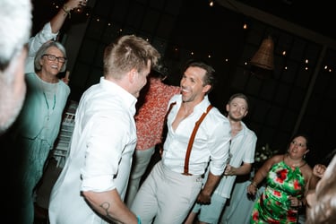 As the evening moved indoors, the celebration shifted into a joyful, relaxed reception filled with laughter, martinis, and dancing. From handheld fans to a one-tier cake adorned with their beloved pups, every detail felt personal and inclusive — a celebration defined by friendship, warmth, and a love that was openly and beautifully shared.